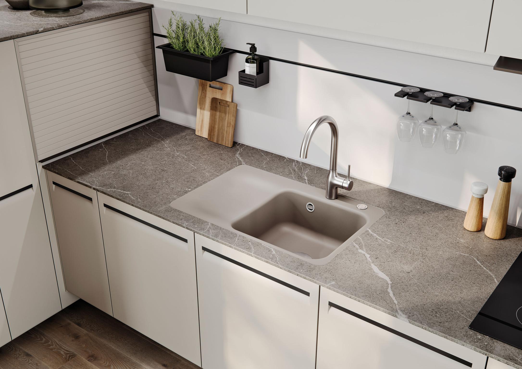 Erhältlich sind die Modelle für den 60 und 50 cm breiten Spülenschrank, als Einbauspüle und in der flächenbündigen Variante. Zur Wahl stehen aktuell 15 Keramikfarben aus glänzenden und matten Glasuren von reinem Weiß bis Tiefschwarz. Jüngster Neuzugang ist die Glasur „Eibe“, ein mattes Dunkelgrün, das sich als Kombinationspartner für Holz- und Naturtöne empfiehlt und sehr gut mit mattschwarzen und metallischen Optiken harmoniert. Weitere natürliche Farbtöne sind auch „Jasmin“, „Fango“, „Schiefer“ oder „Lava“.